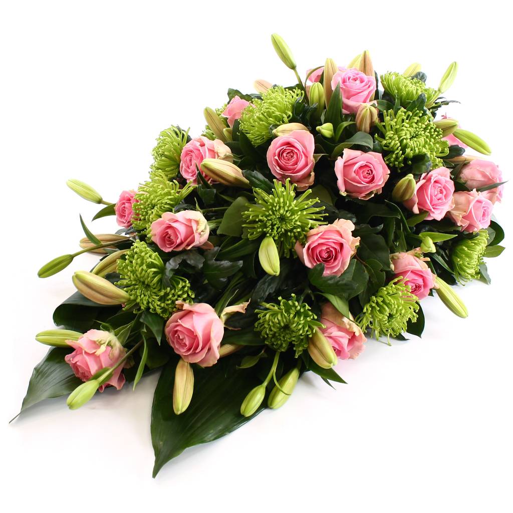 Rouwdruppel roze Rozen met zachtroze Lelies. Dit rouwstuk is beschikbaar in een ‘Groot’ variant en heeft een lengte van ca 55 cm. Een rouwlint of -kaart kunt u in de volgende stap toevoegen.