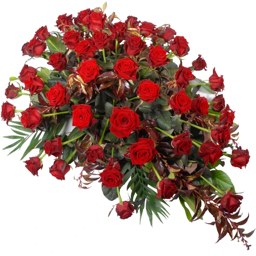 Ovaal rouwstuk, rond rouwstuk, kistbedekking met rode rozen etc.