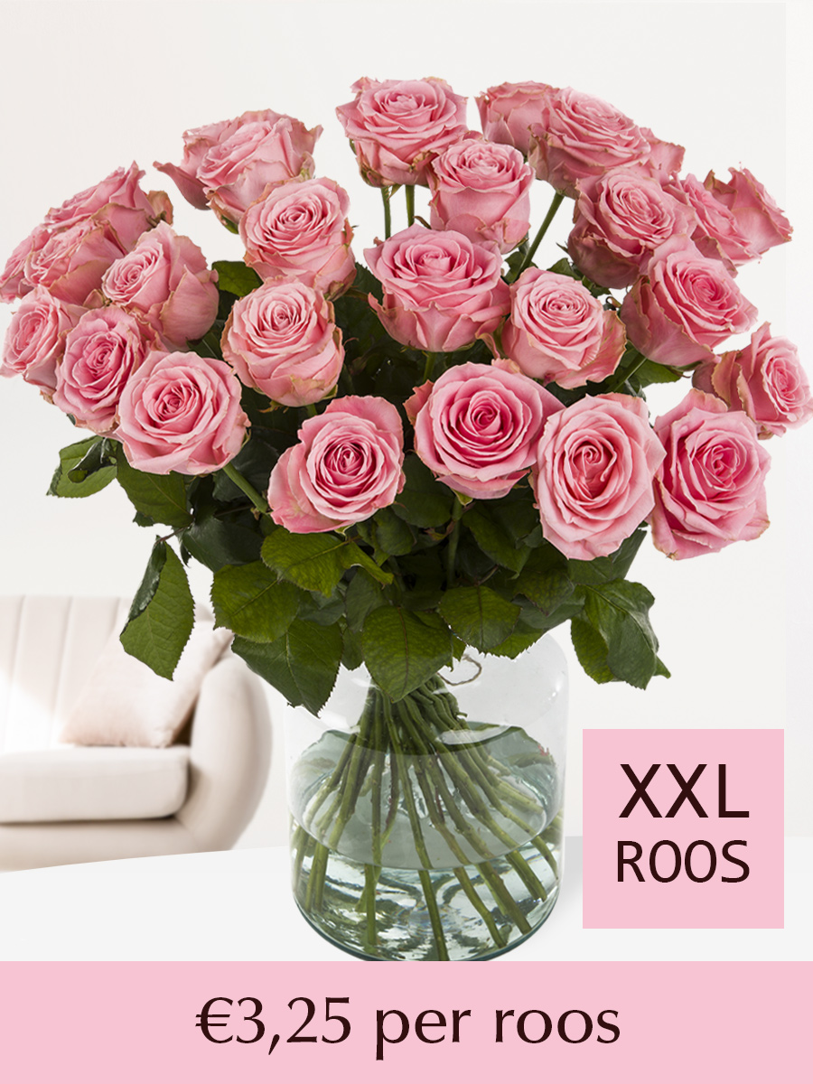 Je kiest zelf een aantal roze rozen uit dat je graag in je boeket zou willen hebben. Zou je graag een witte of rode roos in het midden van het boeket willen toevoegen, dan kan dat! Zorg ervoor dat je het gewenste aantal roze XXL rozen in je winkelmand hebt. Scrol dan naar beneden, hier zul je een aantal producten vinden die je kunt toevoegen aan je winkelmand. Hier staat ook de enkele rode en enkele witte roos tussen. Wanneer je deze aan je bestelling toevoegt, zullen onze bloembindsters deze roos in het midden van je boeket verwerken. Alle boeketten worden liefdevol met de hand gebonden door onze bloembindsters.