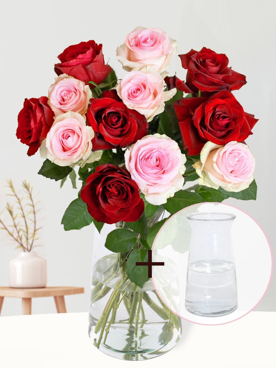 Dit boeket krijg je nu met gratis glasvaas. De glasvaas is van een stevig glas, dat perfect past bij dit boeket. Beide rozensoorten komen uit Kenia, waar ze de hele dag door enorm veel zon krijgen. Zo groeien de rozen snel en worden ze enorm sterk. Ze worden dagelijks vers gesneden bij de kweker, zodat we elke dag verse rozen hebben om te versturen. Zo kun je iemand verrassen met een prachtig boeket verse rozen! Het kan dan ook zijn dat de rozen nog ietwat dicht zijn wanneer ze aankomen. Volg de verzorgingstips en zet de rozen op de vaas met vers water. De rozen komen dan van zelf in een aantal dagen verder open.