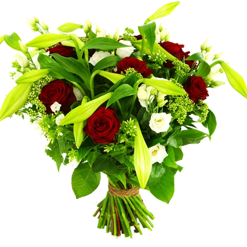 Een wit boeket met o.a. lelies en andere witte bloemen. De rode rozen maken dit boeket speciaal. Bestel online bij BoeketCadeau.nl