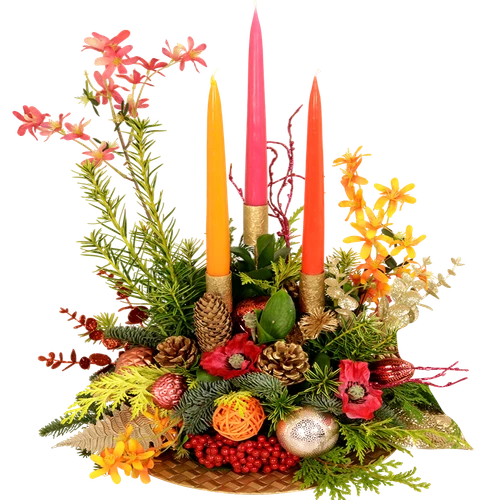 Een kerststuk in de kleuren van deze tijd oranje-roze-rood een nieuwe combinatie van het kleuren spectrum. Kerststuk met 3 kaarsen. Lang houdbaar 4 – 5 weken. Thuiswinkel Lid.