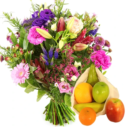 Veld geplukt boeket bloemen bezorgd met een zak vers fruit. Thuiswinkel lid. Snelle bezorging. Versgarantie.