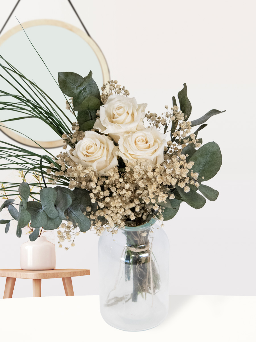 * Diameter boeket: ca. 20 cm Dit boeket is gebonden van 3 witte rozen, eucalyptus, gipskruid en beregras. Alle stelen zijn echt, het zijn geen neppe bloemen. De stelen worden op het beste moment geknipt bij de kweker, waarna ze worden behandeld, zodat jij er jaren lang plezier van kunt hebben. Het exacte proces is geheim, wat we je wel kunnen vertellen is dat ze alle vloeistoffen in de stelen vervangen door een andere biologisch afbreekbare stof.