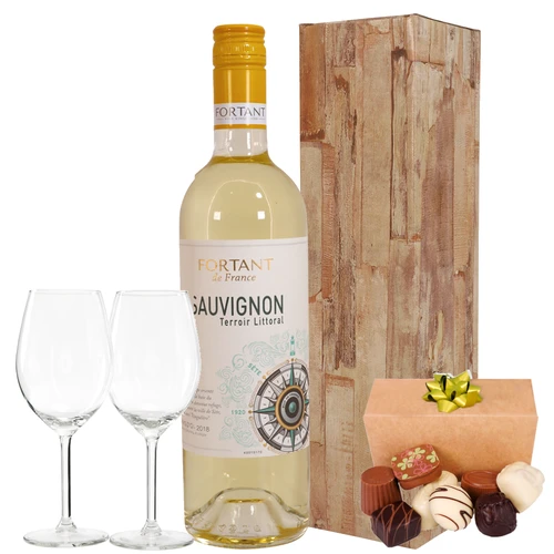 Een compleet wijncadeau: Franse witte wijn met 2 wijnglazen, samen met 150 gram bonbons. Bestel vandaag nog is binnen 24 uur bezorgt. Thuiswinkel Lid